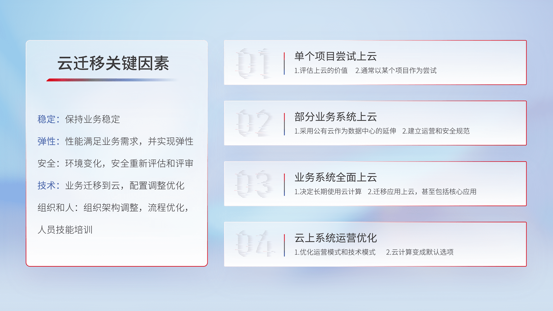 结合实际业务,,,,从规划设计、、云平台选型、、、、云原生改造、、、数据迁移、、、、集成交付,,迁移全过程为客户识别最佳上云路径,,,做好风险识别管理,,,设计网络架构、、、身份权限、、、安全审计合规、、操作审计、、日志审计、、、、监控告警策略、、多站点容灾设计等,,,对云上基础设施进行整体规划,,,提升IT治理水平,,以满足弹性、、高可用、、、高性能的需求。。。。